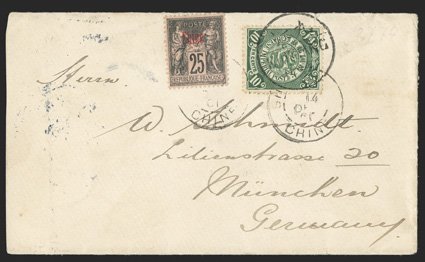 3 c Yvert #8 Image1901 Combination cover from Shanghai to Germany, franked by China 10c CIP Coiling Dragon (Scott #103) tied by bisected bilingual dater to cover to Munich, entered the French mails with 25c Black on rose cancelled by partial "Shang-hai, Chine/14 Dec 01" datestamp which is repeated tying the 10c Coiling Dragon, Munich arrival backstamp, very fine. (Image) Est. $200-300