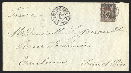 4 c Yvert #8 Image1907 Cover from Hankow to France, franked by 25c Black on rose (Yvert #8) tied by "Han-keou Chine/Poste Francaise/19 Fevr 07" postmark, which is repeated strongly alongside, to folded letter with large handsome partially hand tinted multicolored drawing of a reclining Japanese beauty with fan, with inset of Japanese war ships under way and flags of Japan, U.K. and U.S.A., Eaubonne arrival backstamp, extremely fine. (Image) Est. $150-200