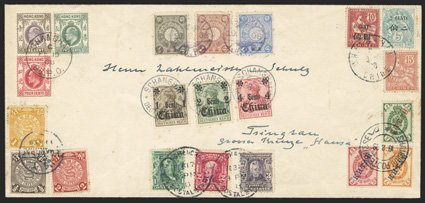 5 c   Image1908 Cover to the German post office in Tsingtau franked by three stamps from each foreign post office comprised of French Offices in China, German Offices in China, Japanese Offices in China, Russian Offices in China and United States, plus Hong Kong and China CIP Coiling Dragons, all tied by their appropriate Shanghai post office postmarks, cover with harmless vertical fold, very fine; a colorful seven country souvenir franking. (Image) Est. $150-200
