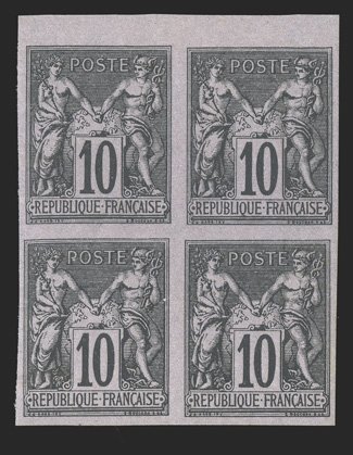 181 og/nhbl Yvert #39, 40, 42, 45 ImageYvert #39, 40, 42, 45, 1878-79 4c Claret on lavender, 10c Black on lavender, 20c Red on green and 35c Black on orange, Types II, wonderfully fresh sheet-margin mint blocks of four, the 35c a bottom right corner sheet-margin example, each with large even margins on the other sides, o.g., 10c and 20c light h.r. at top, 35c l.h. at top, the bottom pairs and all the 4c stamps n.h., except the 20c only one n.h., extremely fine and attractive group (Scott #40, 41, 43, 36; $1,715.00). (Image) for hinged €1,680