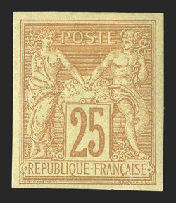 182 og Yvert #43 ImageYvert #43, 1879 25c Black on red, Ty. II, gorgeous top right corner margin single, with generous margins on the other two sides, intense color on fresh paper, o.g., extremely fine; signed A. Brun and Roumet (Scott #44; $600.00). (Image) €700