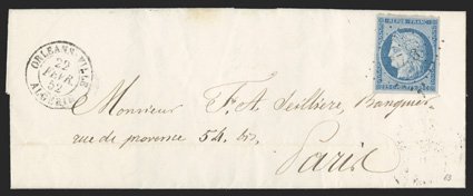 186 c #A6S ImageFrance #6, 1849 25c Blue, four margin single tied by "3733" in dots, with matching "Orleans-Ville Algerie 22 Fevr. 52" c.d.s. on folded letter to Paris, with receiving backstamp, cover is fresh, very fine (Scott #A6S). (Image) Scott $700.00