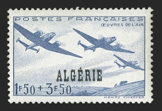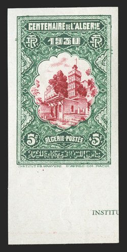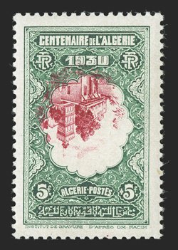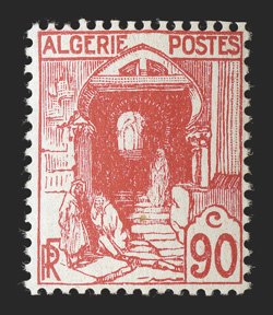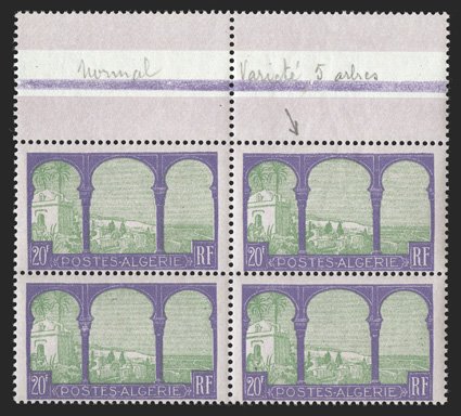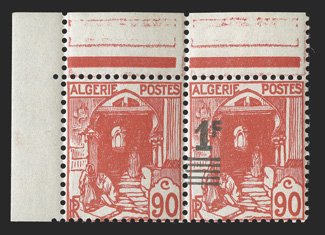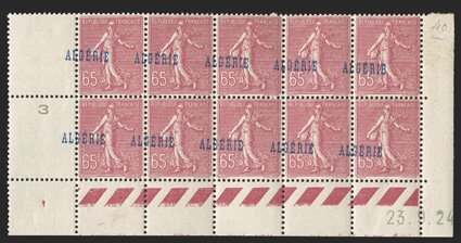 187 nh Yvert #25 var. ImageYvert #25 var., 1924 65c Rose, with "ALGERIE" misplaced, mint block of ten, being the bottom two rows with selvage on three sides, the overprint shifted to the left (into the next stamp), bright and fresh, o.g., stamps all n.h. (hinged in the selvage only), very fine and a handsome showpiece; this value is not listed in Maury with the shifted overprint (Scott #24 var.). (Image) Est. $200-300