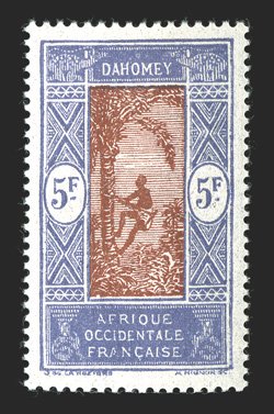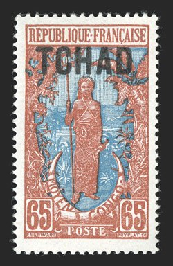301 nh Yvert #41a ImageYvert #41a, 1928 "TCHAD" and "AFRIQUE EQUATORIALE/FRANCAISE" Overprints on 65c Orange brown and blue, omitted "AFRIQUE EQUATORIALE/FRANCAISE", beautifully centered and post office fresh, o.g., n.h., extremely fine (Scott #38a; $375.00). (Image) Maury €500