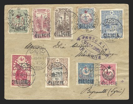 303 c Yvert #1/20 ImageYvert #1/20, 5pa-50pi First overprints, fourteen different values tied by Mersine 12.4.19 c.d.s. postmarks to the front and the back of a cover to Beirut, Syria, with violet oval "PASSE A LA CENSURE" handstamp, cover has trivial crease at left not affecting any of the stamps, fine; while overfranked, it is still a most unusual usage that did postal duty. (imagea) (Image) Est. $200-300