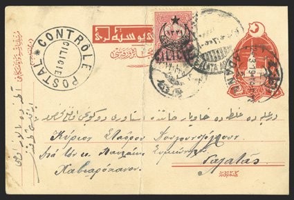 304 c Yvert #5 ImageYvert #5, 1919 20pa Rose with "CILICIE" overprint, tied by c.d.s. handstamp on unoverprinted Turkey 20pa postal card, cancelled by Adana c.d.s. dated 24.3.19, sent to Galata (arrival hanstamp also ties the adhesive), double ring "POSTAL CONTROLE" double-ring postmark at left, card with vertical fold in the middle not affecting stamp or markings, fine; this is the only recorded mixed franking of Turkey and Cilicia. (Image) Est. $500-750
