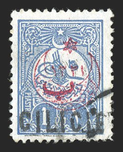 305 O Yvert #7 ImageYvert #7, 1919 1Pi Ultramarine twice overprinted stamp of Turkey, handstamped "CILICIE", used, with light cancel at the bottom right corner, bright color, very fine and scarce (Scott #22C; $1,200.00). (Image) €1,350