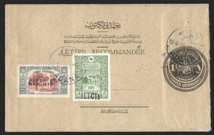 308 c Yvert #14 ImageYvert #14, 1919 5pa Green with "CILICIE" handstamp, tied along with 1¾pi (Yvert #13) on overprinted Turkey 1pi registry envelope by Adana 12.6.19 c.d.s., sent to Tarsous with arrival pmk. on back, very fine; the 5pa stamp is scarce, especially on cover (Scott #9A, 5). (Image) Est. $200-300