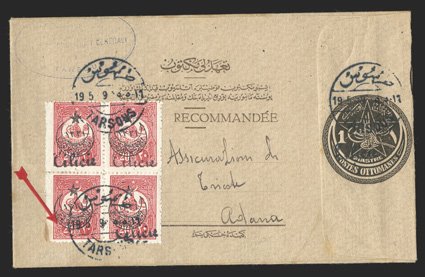 310 c Yvert #44 var. ImageYvert #44 var., 1919 20pa Rose with cursive "Cilicie", overprint omitted, block of four, the bottom left stamp missing the overprint, tied by Tarsous 19.5.9 c.d.s. postmarks on similarly overprint 1pa registry envelope, sent to Adana, light oval merchant's handstamp at top left, the block with a small toned spot at bottom left, otherwise quite fresh and very fine; a scarce error on cover (Scott #56, 56c). (Image) Est. $150-200