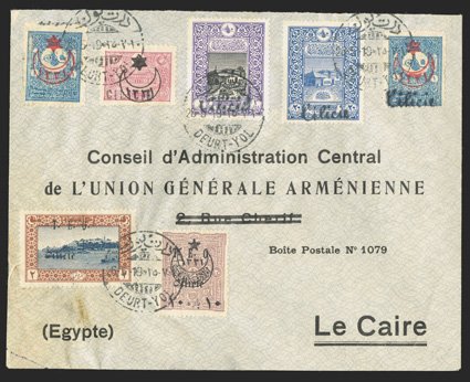 311 c Yvert #45 ImageYvert #45, 1919 1pi Blue with cursive "Cilicie" overprint, two examples, one without the overprint tied along with five other stamps by Deurt-Yol 26.5.19 c.d.s. postmarks on cover to Conseil d'Administration Central de L'Union Generale Armenienne Le Caire (Egypt), backflap missing, fine; it is particularly interesting to have one with and one without overprint on the same cover; at this time Deurt-Yol was occupied by French troops supported by Armenian collaborators. (Image) Est. $200-300