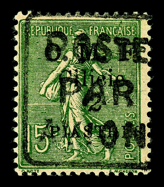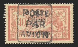 307 og Yvert #7a ImageYvert #7a, 1919 1Pi Ultramarine once overprinted stamp of Turkey, handstamped "CILICIE", nicely centered, strong color, full original gum, trivial h.r., very fine; an especially rare stamp, being one of the keys to completing the country (Scott #22B; $2,250.00) (Image) €2,850