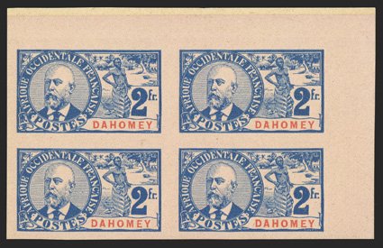 313 ogbl Yvert #19a, 23a, 31a ImageYvert #19a, 23a, 31a, 1906 2c Chocolate, 20c Black on azure and 2Fr. Blue on pink, imperforate cplt., without gum as issued, matched top right corner margin blocks of four, with large margins on the other sides, fresh and extremely fine (Scott #18, 22, 30 vars.). (Image) €1,660+