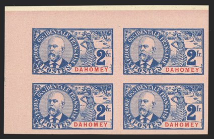314 ogbl Yvert #31a ImageYvert #31a, 1906 2Fr. Blue on pink, imperforate, without gum as issued, top left corner margin block of four, large margins, fresh and extremely fine (Scott # 30 var.). (Image) €960