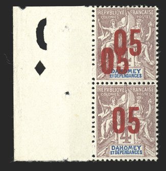 315 og Yvert #34a ImageYvert #34a, 1912 "05" Surcharge on 4c Claret on lavender, double surcharge, striking left sheet-margin vertical pair, the top stamp the error, wonderfully fresh and well centered, o.g., very lightly hinged, very fine; rare as a se-tenant pair with normal (Scott #33a; $260.00+). (Image) for single €300+