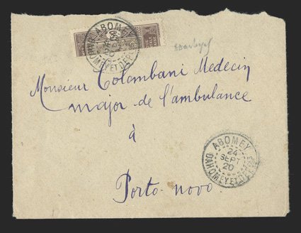 317 c Yvert #55 var. ImageYvert #55 var., 1913 50c Chocolate and brown, bisect, the right vertical half tied to cover to Porto Novo by clear "Abomey, Dahomey et Depses/24 Sept, 20" postmark across the cut, datestamp repeated at bottom right, Porto Novo backstamp, cover roughly opened at top and a portion of the back missing at top, very fine usage (Scott #64a). (Image) Scott $500.00