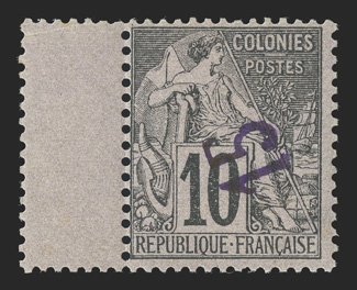 321 nh Yvert #3a ImageYvert #3a, 1890 "15" Surcharge on 10c Black on lavender, inverted surcharge, post office fresh left gutter margin single, immaculate o.g., n.h., fine and rare; signed A. Brun and Roumet (Scott #3a; $1,200.00 for hinged). (Image) for hinged €1,400