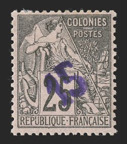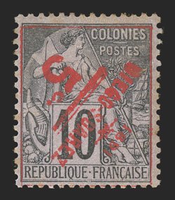 322 og Yvert #5b ImageYvert #5b, 1890 "15" Surcharge on 25c Black on rose, double surcharge, nicely centered and fresh, o.g., h.r., very fine; signed Bernichon (Scott #5b; $475.00). (Image) €620