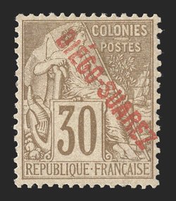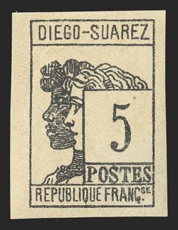 328 og Yvert #21 ImageYvert #21, 1892 "DIEGO-SUAREZ" Overprint on 30c Brown on bister, fresh mint single, o.g., several nibbed perfs at upper left, otherwise fine and rare; only 150 stamps were overprinted; signed Behr and Calves (Scott #21; $1,200.00). (Image) €1,350