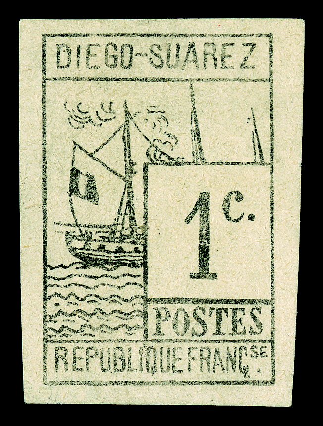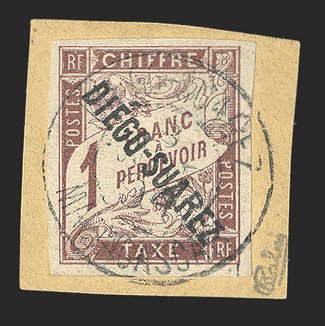 336 p Yvert #TT13 ImageYvert #TT13, 1892 "DIEGO-SUAREZ" Overprint on 1Fr. Brown, tied to small piece by neat 1892 Diego-Suarez postmark, large margins all around, extremely fine and scarce; only 150 stamps were overprinted; signed Calves (Scott #J13; $1,500.00). (Image) €1,650