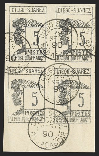 326 og Yvert #11a ImageYvert #11a, 1891 "1891/DIEGO-SUAREZ/5c." Surcharge on 10c Black on lavender, inverted surcharge, o.g., h.r., a few lightly foxed perfs not visible on face, otherwise very fine; signed Thiaude (Scott #11a; $450.00). (Image) €550
