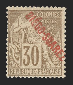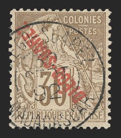 329 O Yvert #21a ImageYvert #21a, 1892 "DIEGO-SUAREZ" Overprint on 30c Brown on bister, inverted overprint, seldom seen used example, beautifully cancelled by 30 September 1892 datestamp, strong color on fresh paper, very fine; only 150 stamps were overprinted and of these few received an inverted overprint, all of which were used; signed Calves and Roumet (Scott #22a; $1,600.00). (Image) €1,800