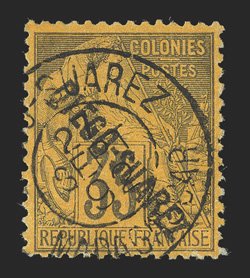 330 O Yvert #22 ImageYvert #22, 1892 "DIEGO-SUAREZ" Overprint on 35c Black on yellow, scarce used single, cancelled by neat 27 September 1892 postmark, bright and fresh, very fine; only 250 stamps were overprinted; signed A. Brun, Calves and Gilbert (Scott #22; $925.00). (Image) €1,000
