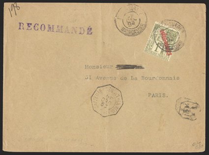 331 c Yvert #24a ImageYvert #24a, 1892 "DIEGO-SUAREZ" Overprint on 1Fr. Bronze green on straw, double overprint, tied to registered cover to Paris by "Diego-Suarez, Madagascar/28 Dec 94" c.d.s. which is repeated alongside, octangular "La Reunion a Marseille" transit and Paris arrival backstamp, very fine and rare on cover usage; signed Calves twice (Scott #24a). (Image) Est. $400-500