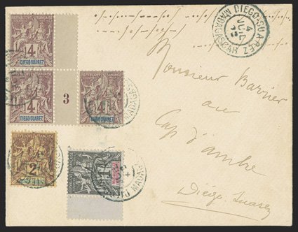 333 c Yvert #39-40 ImageYvert #39-40, 1892 2c Brown on buff and 4c Claret on lavender, single of former and single and vertical right gutter margin pair with millesimes "3" of latter, tied along with Madagascar #28 to locally addressed cover by "Diego-Suarez/4 Juil, 92" datestamps, postmark repeated at top right, very fine and colorful (Scott #26-27). (Image) Est. $150-200