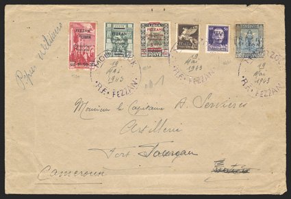 337 c Yvert #1/19 ImageYvert #1, 5, 7, 19, PA1, PA2, Six different values of the 1943 French occupation, tied by large circular "MOURZOUK, R.F. FEZZAN" c.d.s. with 19 May 1943 date inserted by hand on large cover to Fort Foureau, Cameroun, with arrival backstamp of 22 Sept., cover with edge wear, stamps with some gum staining, fine; a rare commercial usage; signed Calves four times. (Image) Est. $400-500