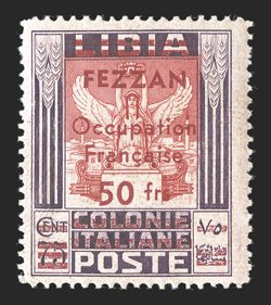 338 nh Yvert #10 ImageYvert #10, 1943 75c Violet and red, with "FEZZAN/Occupation/Francaise/50 frs" surcharge, a most desirable mint example of this rare stamp, lovely bright colors, o.g., never hinged, very fine; only 79 were issued, with fewer than that in existence today, and even fewer are in this never hinged condition; signed A. Brun, Roumet. (Image) for hinged €6,850