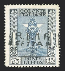 340 og Yvert #19 ImageYvert #19, 1943 25c Blue and Ultramarine, with "R.F. 1 Fr/FEZZAN" handstamp, rich colors, o.g., very lightly hinged, light horizontal crease, fine appearance; a rare stamp, especially mint; signed Roumet and accompanied by a clear 1995 Calves certificate. (Image) €5,500