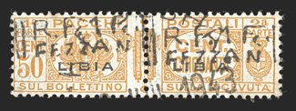341 O Yvert #23 ImageYvert #23, 1943 50c Orange parcel post, with "R.F. 1Fr/FEZZAN" handstamp, used pair, bright color on fresh paper, fine; only 90 pairs were issued; signed Fulpius, Roumet. (Image) €1,100