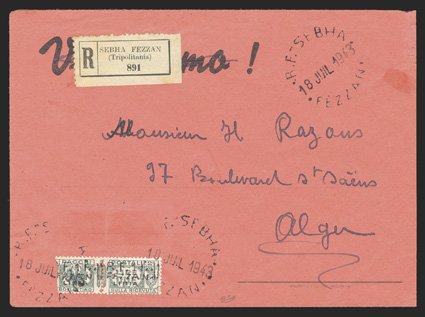 342 c Yvert #27 ImageYvert #27, 1943 4l Gray green parcel post, with "R.F. 1Fr/FEZZAN" handstamp, complete right stamp and half of the left stamp tied by "R.F. SEBHA FEZZAN 18 JUIL 1943" c.d.s. pmks. on registered cover to Alger, with arrival backstamp, cover opened at top and right, fine; a very rare stamp on cover; signed Calves. (Image) Est. $1,000-1,500