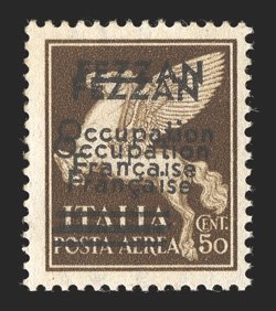 344 og Yvert #PA1a ImageYvert #PA1a, 1943 50c Brown, with "FEZZAN/Occupation/Francaise" double overprint, rich color, o.g., lightly hinged, very fine and scarce; signed H. Bloch and accompanied by a 1983 E. Diena certificate. (Image) $1,200.00