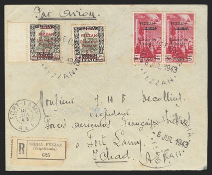 345 c Yvert #7, PA2 ImageYvert #7, PA2, 1943 5Fr. on 50c Black and olive, 7.50Fr. on 50c Rose air post, two singles of the former and a horizontal pair of the latter, tied by "SEBHA FEZZAN 6 JUIL 1943" c.d.s. postmarks on registered airmail cover to Fort Lamy, Chad, with receiving backstamps of 10 July, also a backstamp "CONTROLE POSTAL Commission G/ AFRIQUE EQUATORIALE FRANCAISE" handstamp, cover with small scuff in the address portion, some mild toning, fine. (Image) Est. $200-300