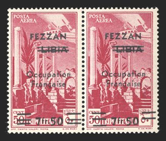 351 nh Yvert #TT2a, 2b ImageYvert #TT2a, 2b, 1943 10c Blue postage due, with "FEZZAN/Occupation/Francaise/TAXE 1 fr." double surcharge in black and red, top right corner margin vertical strip of three, the top two stamps with the double surcharge, while the bottom stamp is the normal black overprint, o.g., n.h., light horizontal crease in top stamp, otherwise very fine; a spectacular and exceedingly rare showpiece; signed several times including Calves, and accompanied by a 1989 E. Diena certificate. (Image) €11,400+