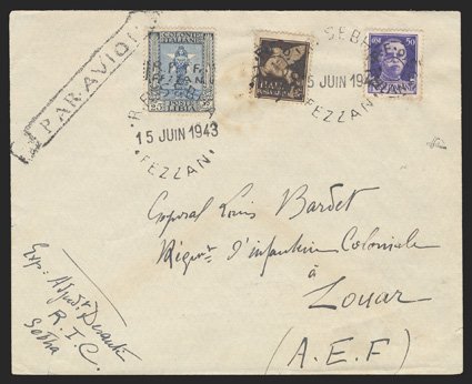 348 c Yvert #18, 19, PA3 ImageYvert #18, 19, PA3, 1943 50c Violet, 1Fr. Blue and ultramarine, and 50c Brown air post surcharges, the first and third being the rare circular surcharges, tied by "R.F. SEBHA FEZZAN 15 JUIN 1943" rimless c.d.s. pmks. on cover to Zouar, with receiving backstamp of 30 June, handstamped "PAR AVION" also ties the 1Fr on 25c stamp, some mild toning, fine; the airpost stamp is particularly rare on cover, Maury lists the value of that stamp at €4,000; signed C. Isaac, J-F Brun. (Image) Est. $1,000-1,500