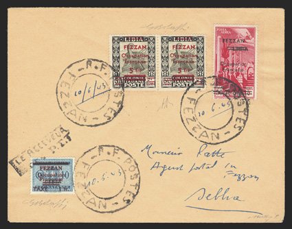 352 c Yvert #TT2a ImageYvert #TT2a, 1942 10c Blue postage due, with "FEZZAN/Occupation/Francaise/TAXE 1fr." double surcharge in red and black, well centered and fresh single tied "R.F. POSTES FEZZAN" c.d.s. with 10.6.43 date inserted by hand, along with Yvert #7 pair and PA2 tied by same cancels on cover to Sebha, the rare postage due stamp also tied by boxed "LE ACCEVEUR P.T.T." handstamp, overall very fine; only 95 of the 10c postage due were made, with only a tiny percentage of those possessing the double overprint, in addition the certificate states this is the unique example on cover; signed A. Diena and Bolaffi and accompanied by a 1988 Bolaffi certificate; catalogs €4,400 just as a used stamp. (Image) Est. $2,000-3,000