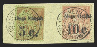 356 p Yvert #3, 6 ImageYvert #3, 6, 1891-92 "COngo Francais/5 C." Surcharge on 20c Red on green and "COngo Francais/10 C." Surcharge on 40c Red on straw, both tied to a piece by 22 October 1892 Libreville datestamps, fresh and very fine; only 1,200 and 1,000 stamps were surcharged; signed J-F Brun and Roumet (Scott #6, 9; $775.00). (Image) €980