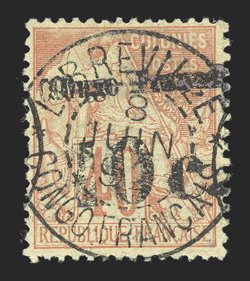 357 og Yvert #6 ImageYvert #6, 1891-92 "COngo Francais/10 C." Surcharge on 40c Red on straw, fresh color, disturbed o.g., h.r., fine and rare; while 1,000 stamps were surcharged most were used as postage; signed A. Brun, Calves and Senf (Scott #9; $2,400.00). (Image) €3,200