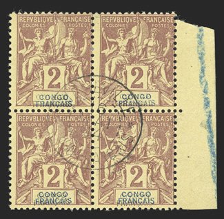 362 Obl Yvert #13a ImageYvert #13a, 1892 2c Brown on bluff, double inscription in black and blue, right sheet-margin used block of four, light central 16 May 1894 Libreville c.d.s., fine; signed A. Brun twice and Kohler twice (Scott #19a; $700.00 for singles). (Image) for singles €800