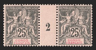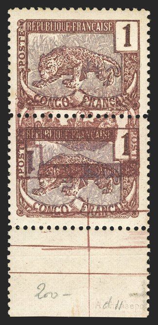 368 nh Maury #27h ImageMaury #27h, 1900 1c Brown violet and grey lilac, double impression, one inverted, striking bottom sheet-margin vertical pair, showing the second impression split horizontally and guide lines in the selvage, excellent centering, o.g., n.h., extremely fine; signed Roumet (Scott #35 var.). (Image) €1,200