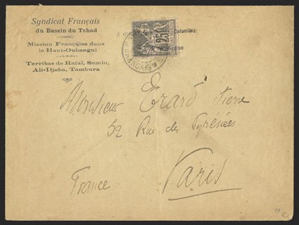364 c   Image"A defaut de timbres Coloniaux/Pays de la Mission" two-line straightline handstamp tying France 25c Black on rose (#97) to cover to Paris with "Syndicat Francais du Bassin du Tchad, Mission Francaise dans le Haut-Oubangui, Terribas de Rafai, Semio, Ali-Djaba, Tambura" corner card, "Abiras, Congo Francaise/? Dec 97" postmark also ties the stamp, cover with a vertical fold through the adhesive and tape stains on reverse, not noted on the certificate, very fine usage; only a few examples of this handstamp are known; signed Roumet and accompanied by his 2007 certificate. (Image) Est. $500-750