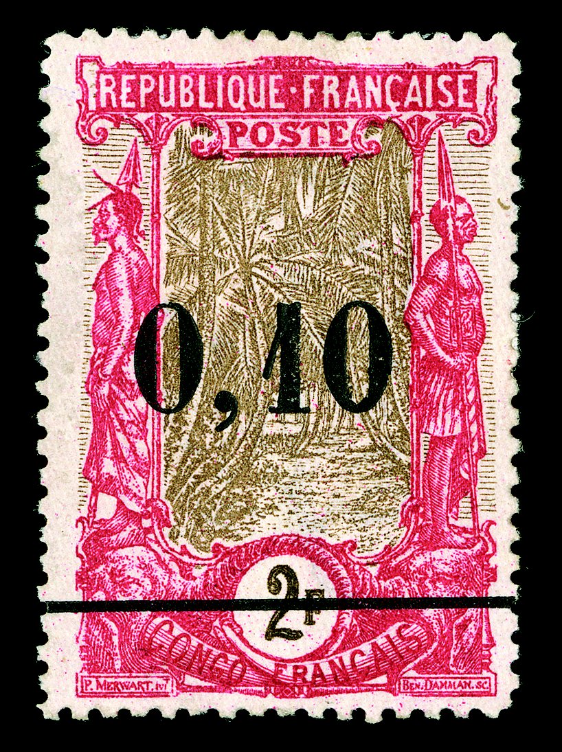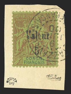 365 p Yvert #25 ImageYvert #25, 1900 "Valeur/5" Surcharge on 20c Red on green, a desirable used example of this rare provisional surcharge which was only in use for four days, tied to piece by 9 July 1900 Brazzaville first day of issue postmark, rich colors on fresh paper, very fine; only 300 stamps were surcharged, however most were burned when withdrawn on 12 July; signed A. Brun, Calves and Roumet, as well as being accompanied by 2002 Roumet certificate (Scott #50; $6,000.00). (Image) €7,500