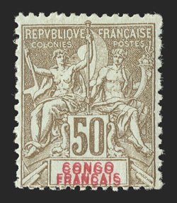 367 og Yvert #45a ImageYvert #45a, 1900 50c Brown on azure, double inscription, remarkably fresh, o.g., l.h., fine; signed A. Brun twice and Champion (Scott #32a; $750.00). (Image) €935