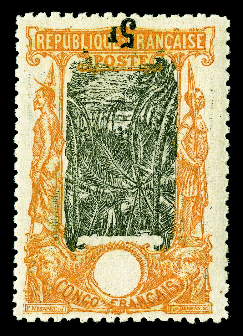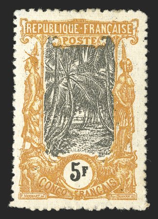 371 og/nh Maury #39ba, 41ba ImageMaury #39ba, 41ba, 1900 1Fr. Grey lilac and olive and 5Fr. Brown orange and grey, inverted centers, values and watermarks, fresh mint singles of each, the 5Fr. unusually well centered, o.g., 1Fr. h.r. and 5Fr. n.h., fine-very fine and scarce; 5Fr. signed A. Brun and Roumet (Scott #47a, 49b var.; $700.00 for hinged with upright watermarks). (imagea) (Image) for hinged €1,700