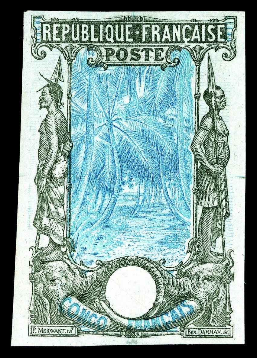 375 E   Image1900 Bakalois woman and coconut grove "jumbo" bi-colored essays, three different 31x48 essays, first of 20c Bakalois woman issued design in carmine and ocher, second of non-denominated Bakalois woman in dark blue and vermilion and third a non-denominated coconut grove design in grey and ultramarine, very fine and attractive trio. (imagea) (imageb) (Image) Est. $200-300