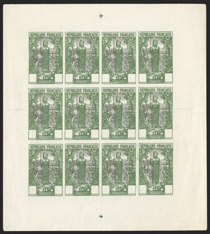 376 TCbl   Image1900 Bakalois woman bi-colored trial color proofs, six different miniature sheets of twelve, each with background in black, comprised of frames in violet, green, blue, red, ochre and brown, first with a horizontal crease between two rows, otherwise extremely fine and attractive. (Image) Est. $500-750