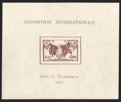 379 og Yvert #BF1a ImageYvert #BF1a, 1937 3Fr. Colonial Arts Exhibition souvenir sheet, inverted inscriptions at top and bottom as well as the colony name, o.g., light h.r.'s, corner crease at bottom left, otherwise very fine (Scott #73 var.). (Image) €1,350