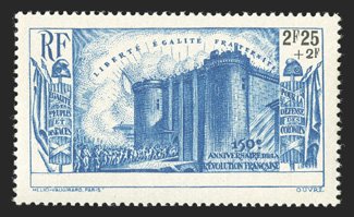 380 nh Yvert #76a ImageYvert #76a, 1939 2.25Fr.+2Fr French Revolution, omitted name of colony, pristine o.g., n.h., extremely fine; signed A. Brun (Scott #B8 var.). (Image) Maury €550